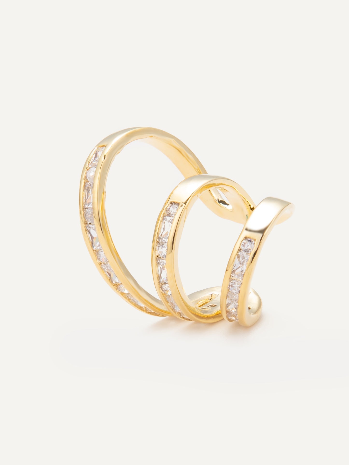 A double-band ear cuff with channel-set crystals, offering a sleek, polished shimmer with a modern edge.