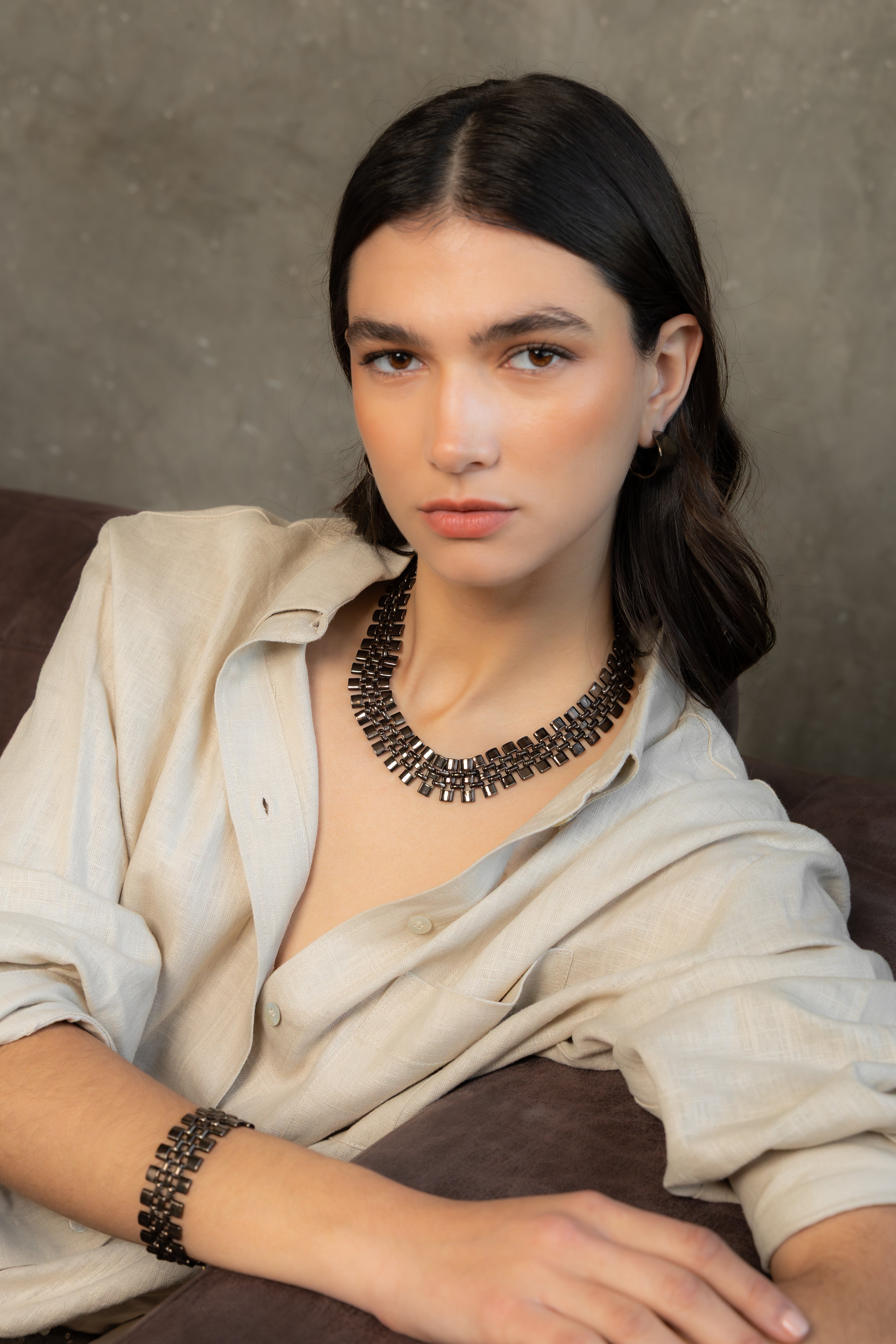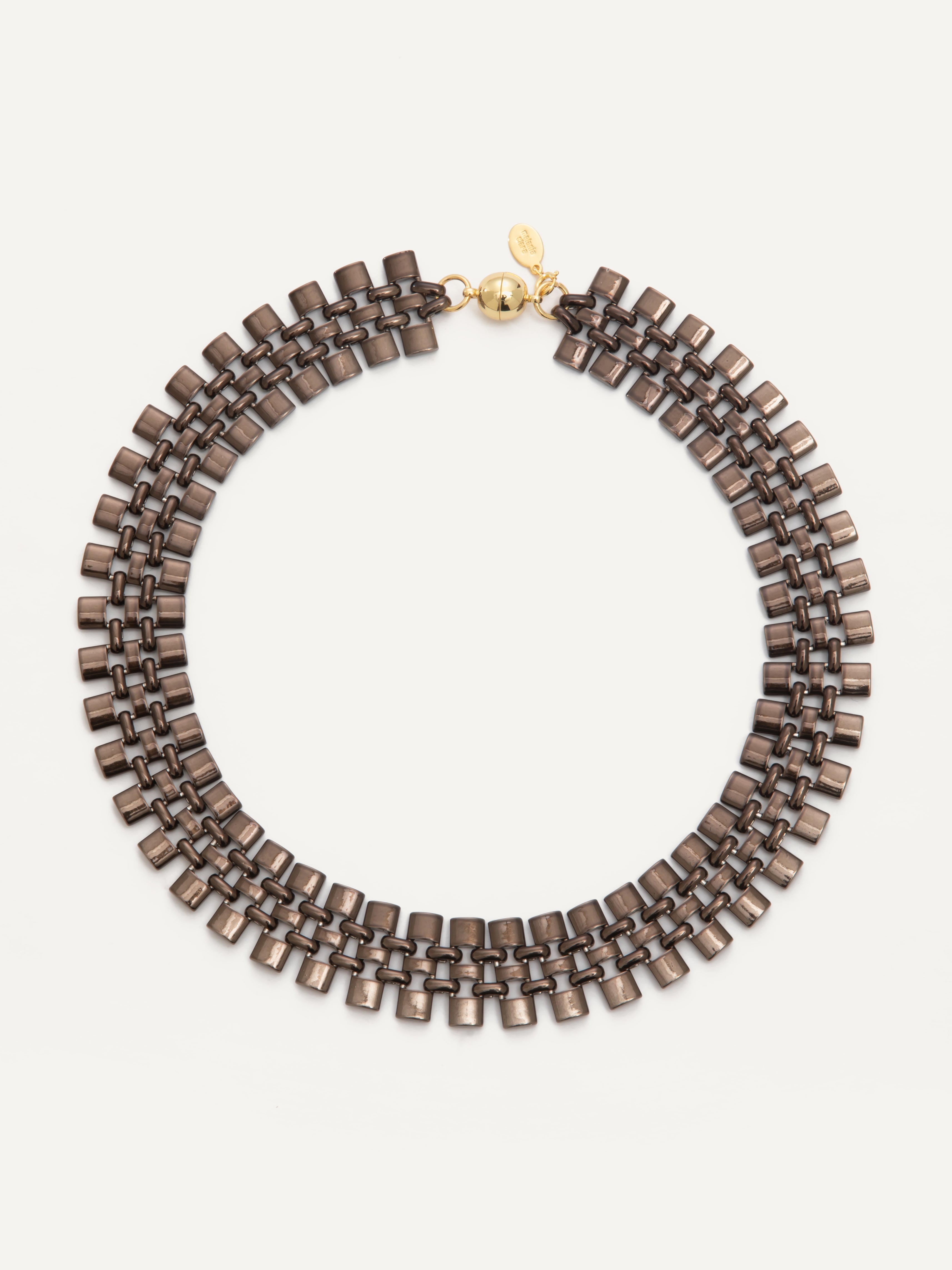 Bold symmetry. This necklace features structured rows of square-edged links, creating a striking, architectural look. Its polished finish and precise construction make it a statement piece that sits beautifully along the collarbone.