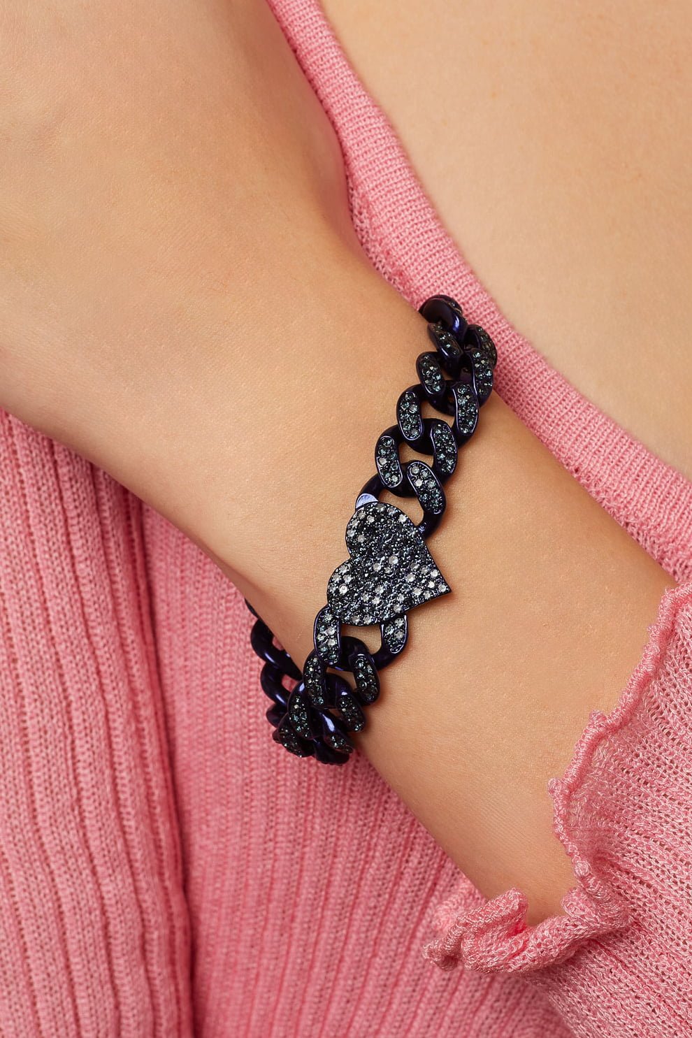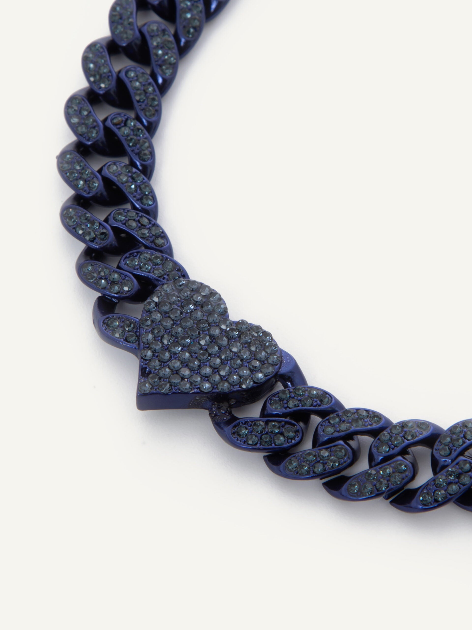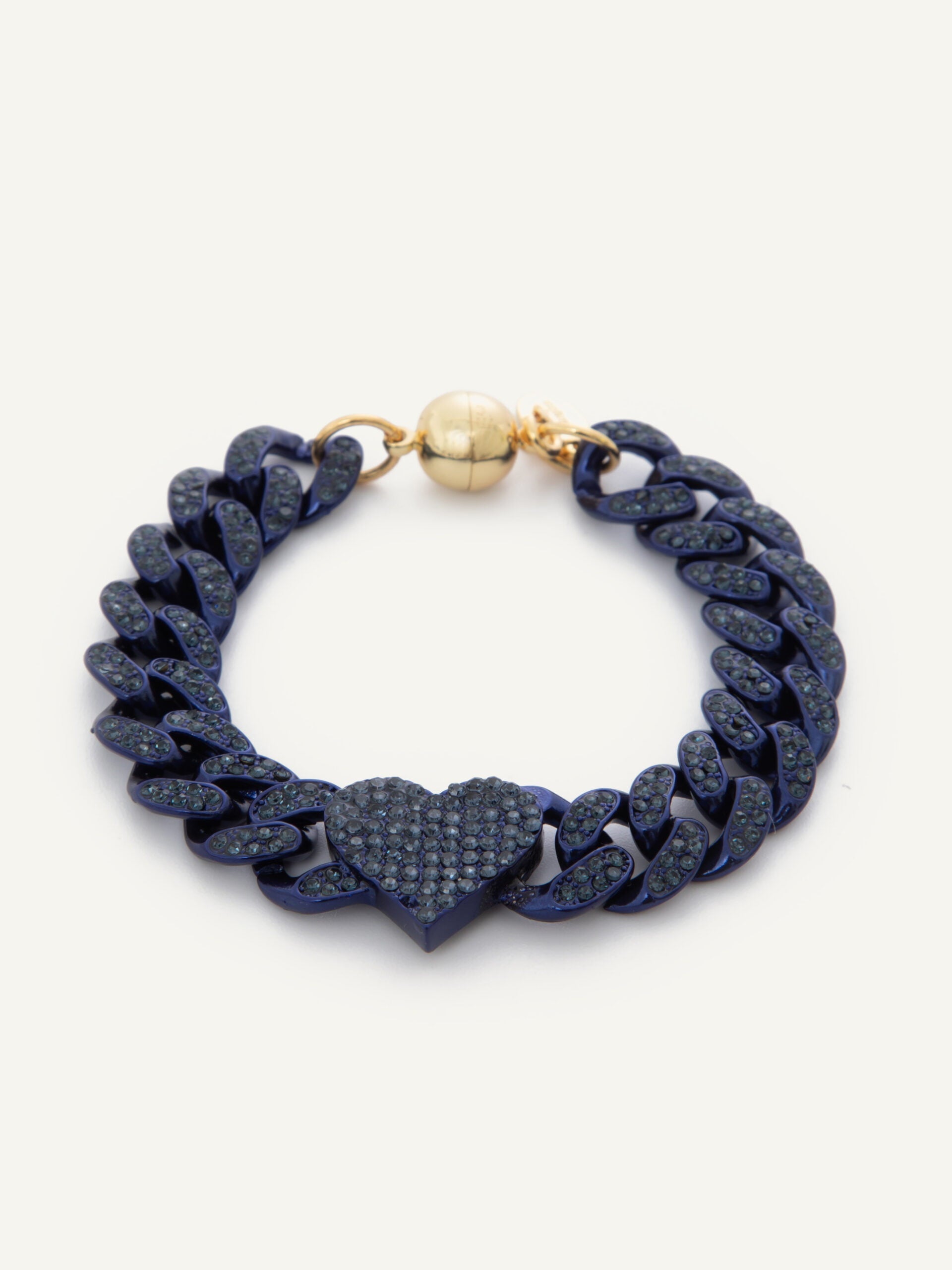 Handset crystal curb link chain bracelet with heart link connectors.