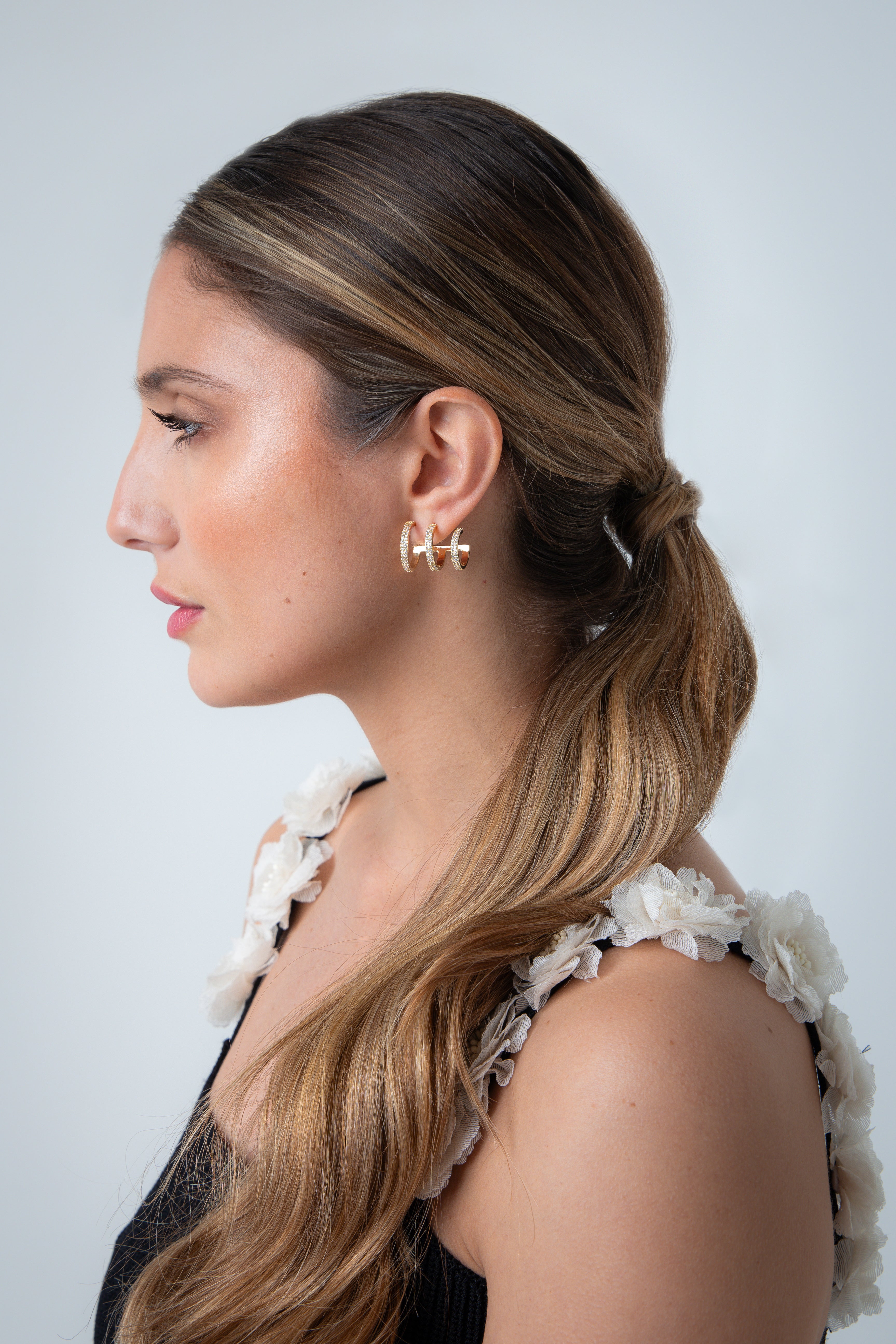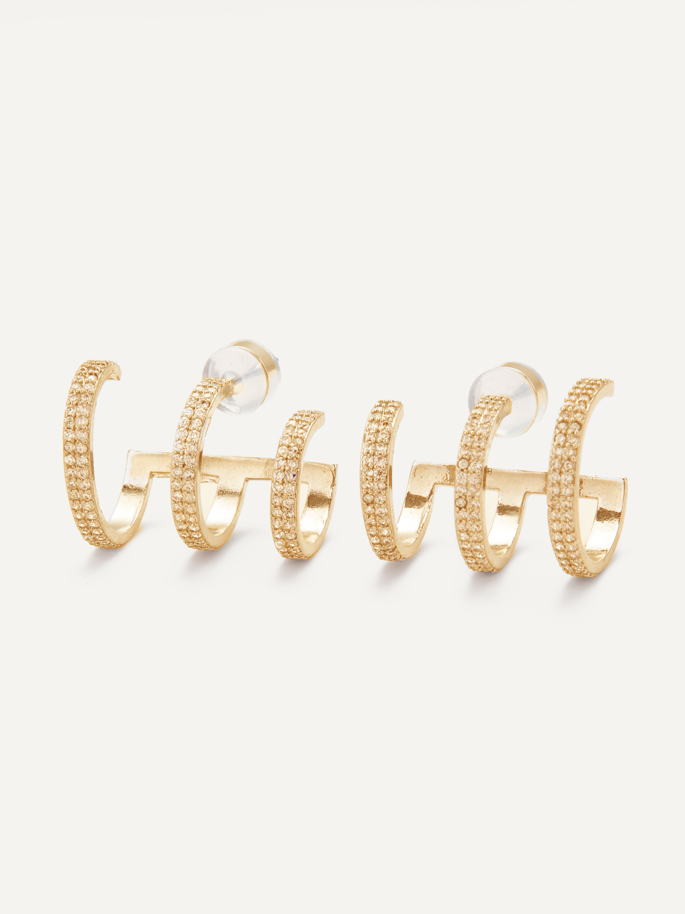 Multi-hoop illusion earrings adorned with pavé crystals, creating a layered look in a single statement piece.