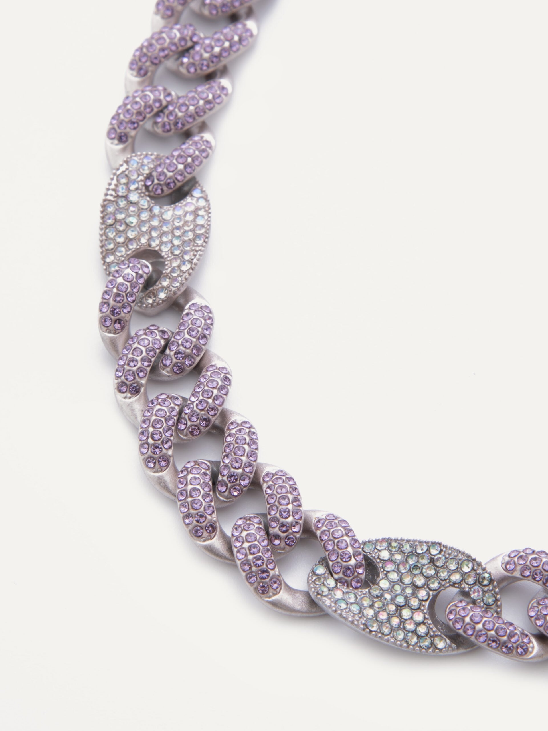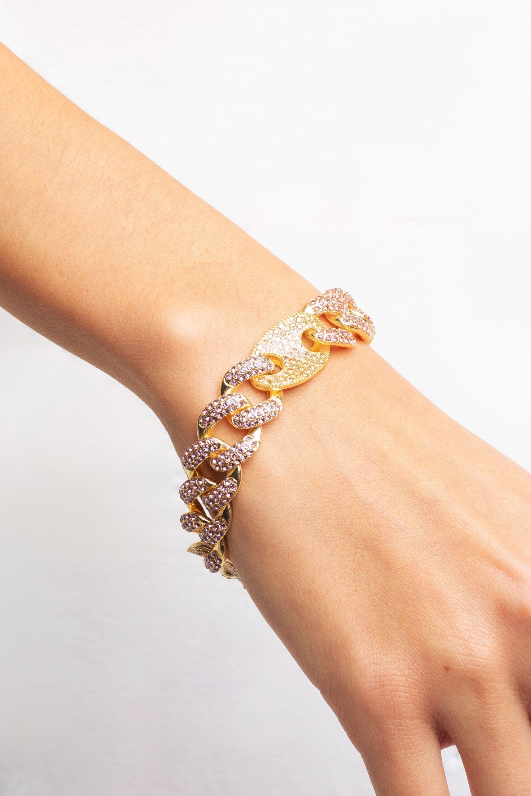 Crystal curb link chain bracelet with mariner link connectors.